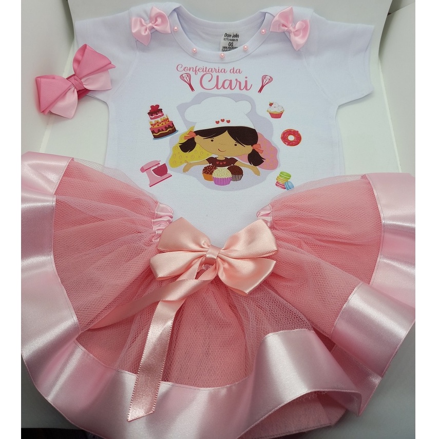 Body personalizado para mesversario ou aniversario com saia de tule e la o tema Confeitaria Very well made.