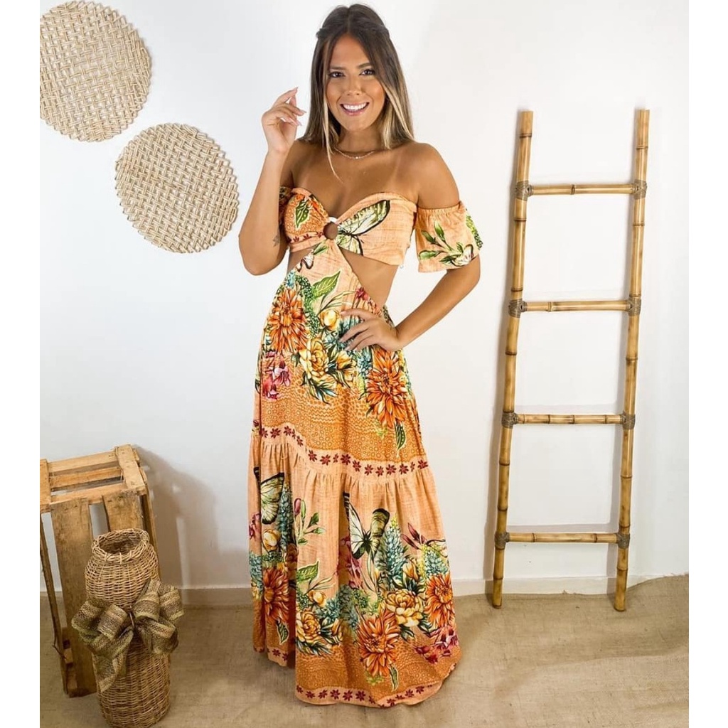 Vestido longo floral estampado ombro a ombro ciganinha com manga decote abertura lateral na barriga Very well made.