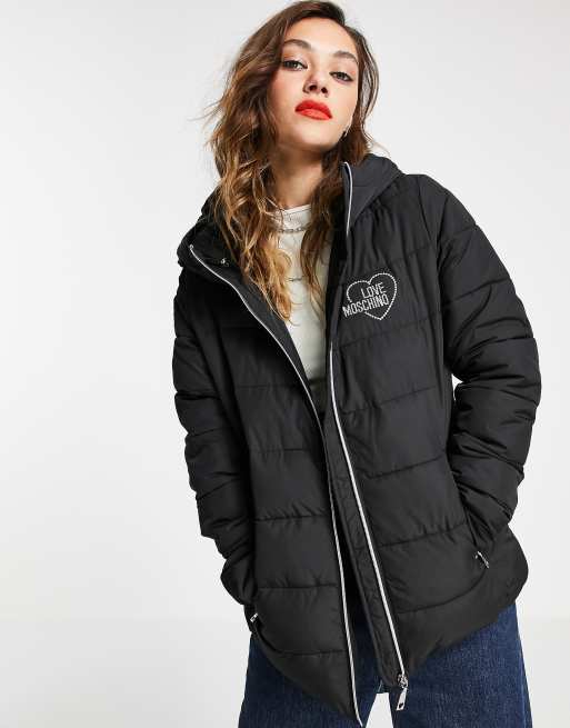 Love Moschino logo front hooded quilted jacket in black Very well made.