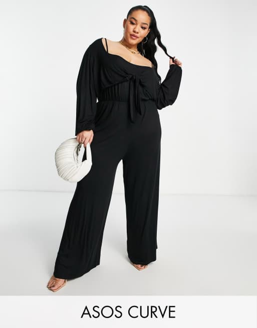 ASOS LUXE Curve satin corsage plunge neck wide leg jumpsuit in black Very well made.