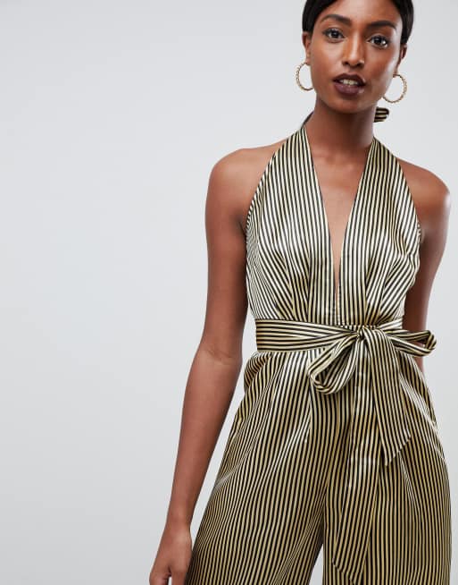 ASOS DESIGN Tall satin halter jumpsuit in metallic stripe Very well made.