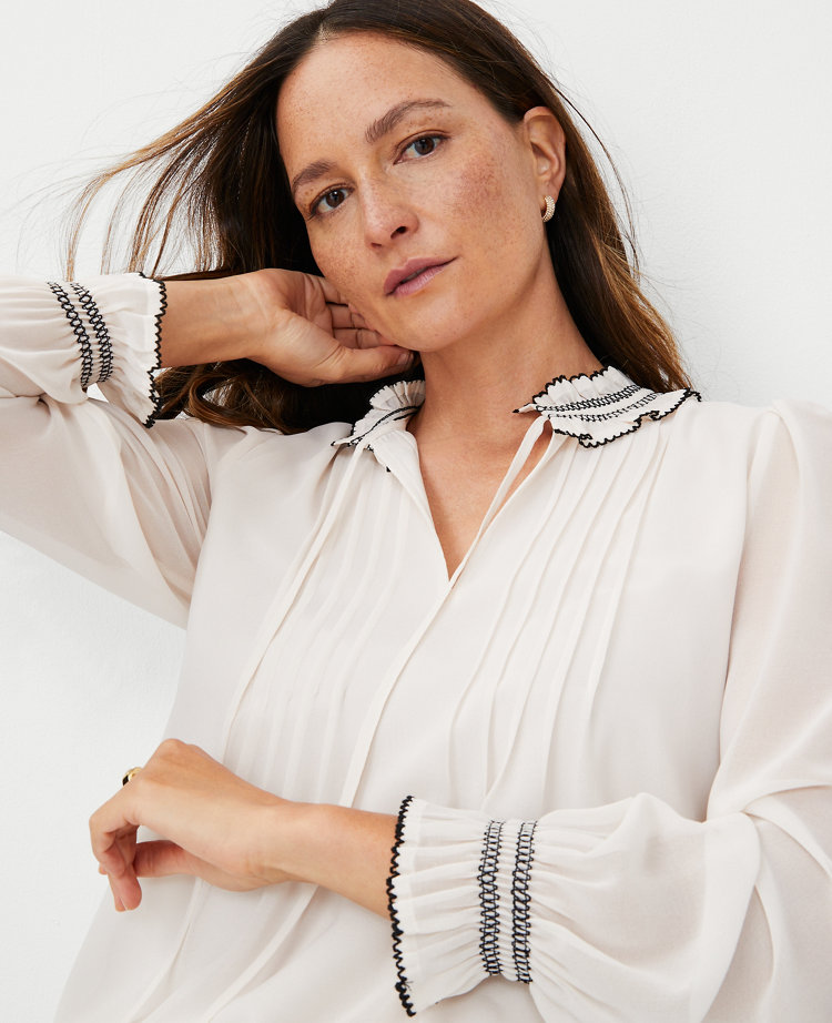 ANN TAYLOR Tops and Blouses Floral Ruffle Pintucked Popover Shell Black Womens Zero Matters Very well made.