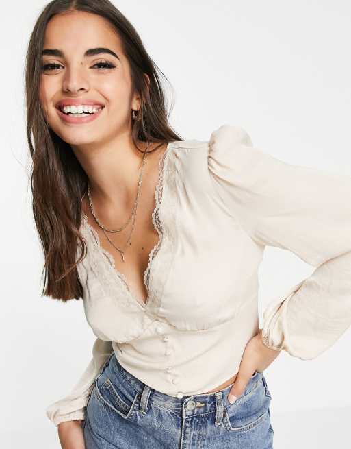 Stradivarius satin button detail romantic blouse in beige Very well made.