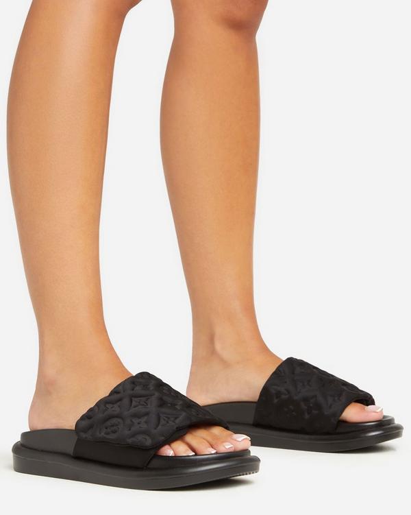 It s A Vibe Embossed Velcro Strap Flat Slider Sandal In Black Lycra Very well made.