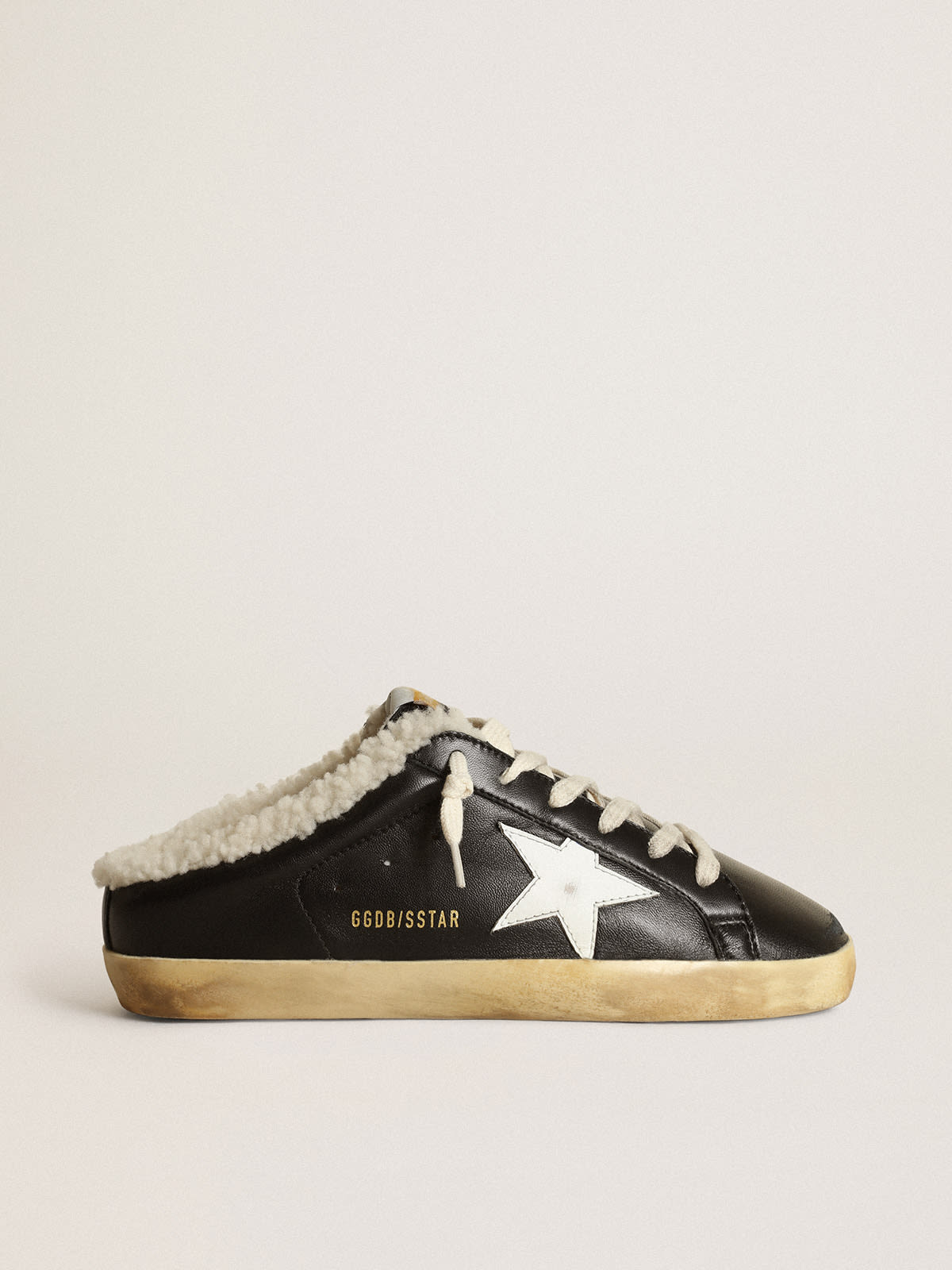 Super Star Sabots in black nappa leather with white leather star and beige shearling lining Very well made.